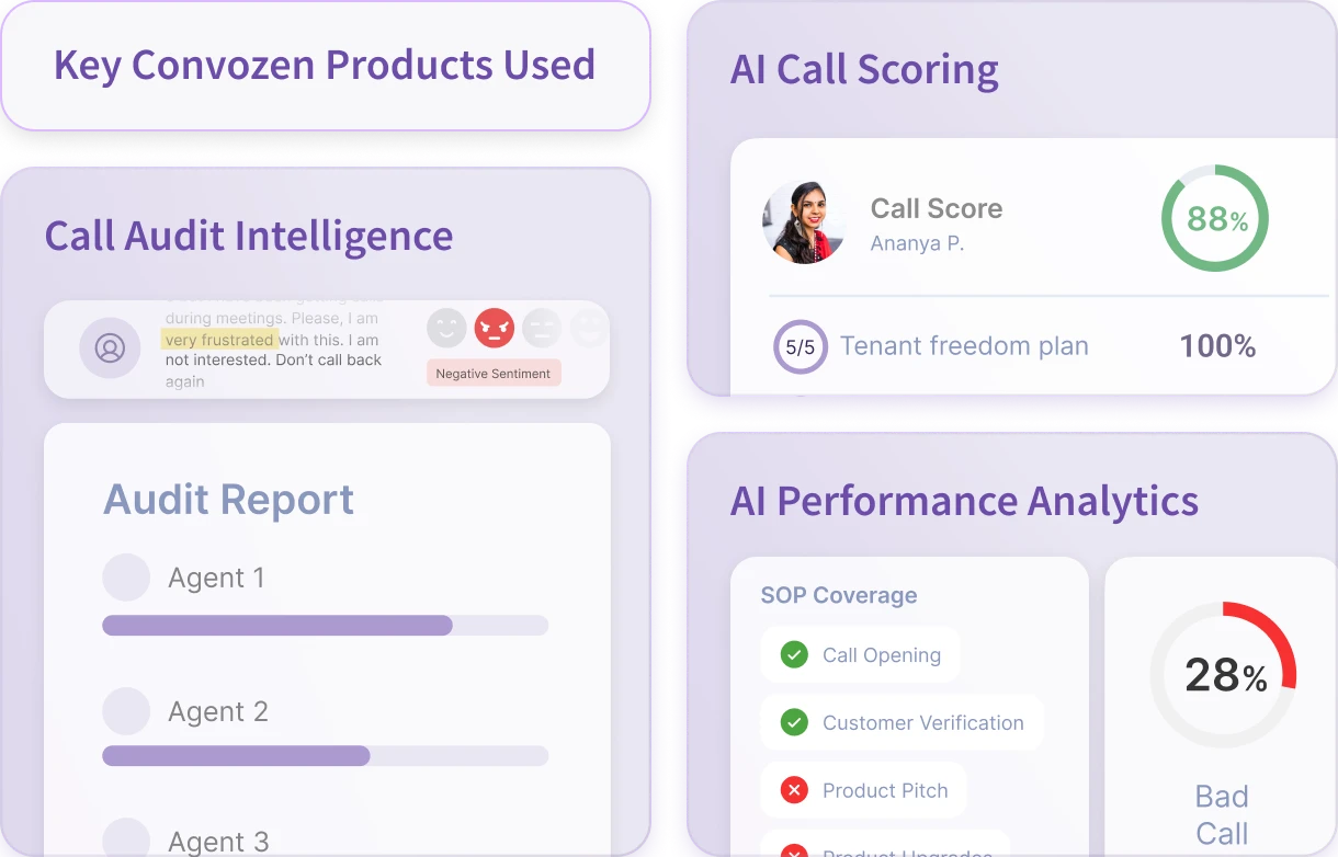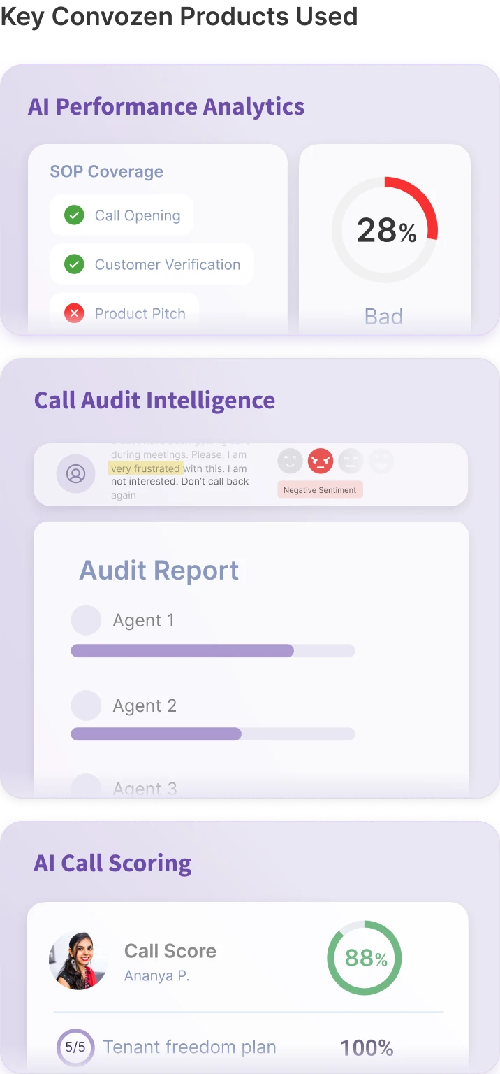 Automated Call Scoring: Convozen.AI automatically scored 100% of calls against more than ten critical performance parameters, providing immediate, objective insights.