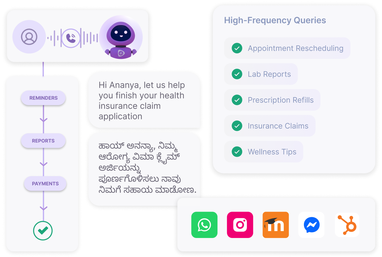 Instantly resolve high-frequency queries like appointment rescheduling, lab reports, prescription refills, insurance claims, and wellness tips, without waiting for human assistance